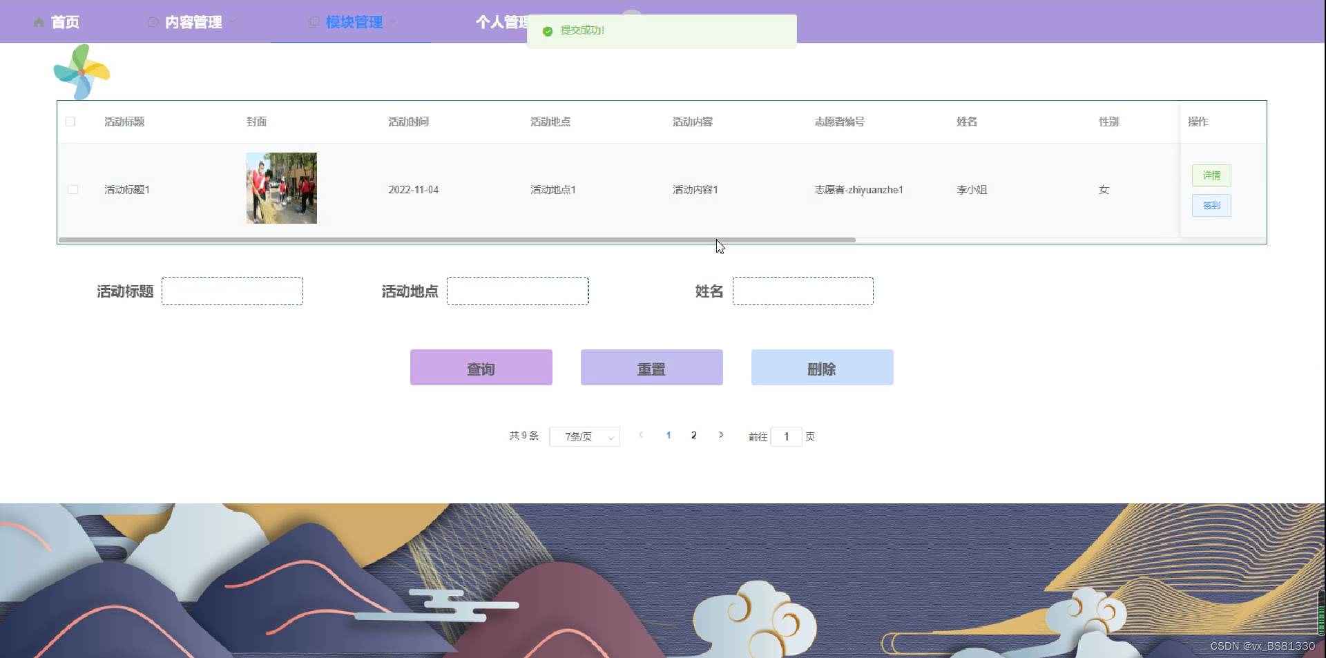 | 测试目的 | 检测志愿活动管理时的各种操作的运行情况 | |