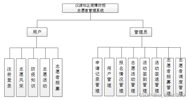 这些功能可以充分满足汉源社区疫情防控志愿者管理系统的需求。此系统功能较为全面如下图系统功能结构如图4-5所示。