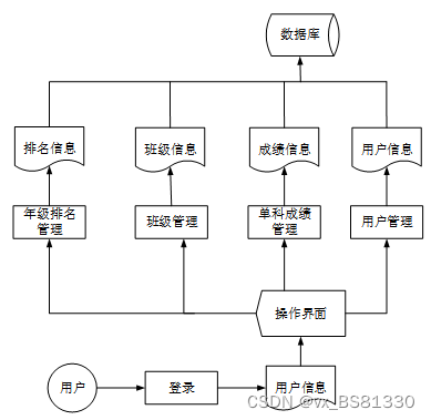 数据层(DL):由于本中学成绩管理系统的数据是放在服务端的mysql数据库中,因此本属于服务层的部分可以直接整合在业务逻辑层中,所以数据层中只有数据库,其主要完成本中学成绩管理系统的数据存储和管理功能。