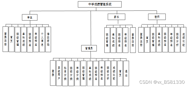 在上一章节中主要对系统的功能性需求和非功能性需求进行分析,并且根据需求分析了本中学成绩管理系统中的用例。那么接下来就要开始对本中学成绩管理系统 的架构、主要功能和数据库开始进行设计。中学成绩管理系统根据前面章节的需求分析得出,其总体设计模块图如图3-2所示。