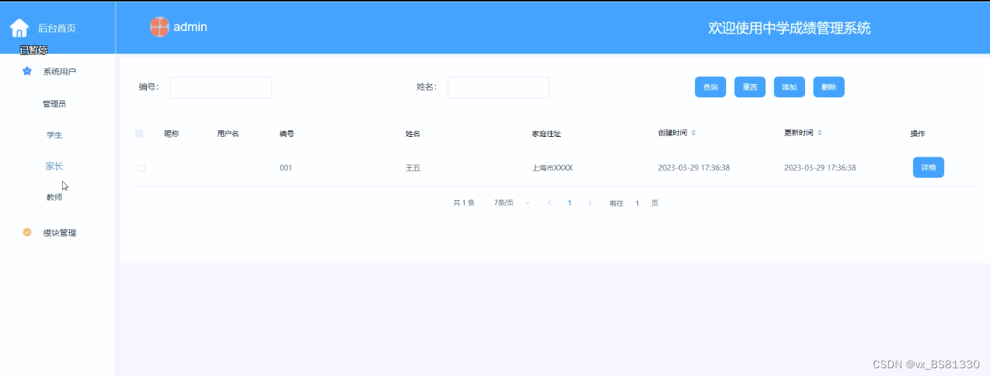 (2)用户管理:管理员可以对系统中所有的用户角色进行管控,包含了管理员、学生、家长以及教师这四种角色,如果需要添加新的用户,点击页面中的“添加”按钮根据提示输入上用户信息,点击“提交”以后在对应的用户界面就可以查看到了,可以点击用户后面的“删除”按钮直接删除某一用户。