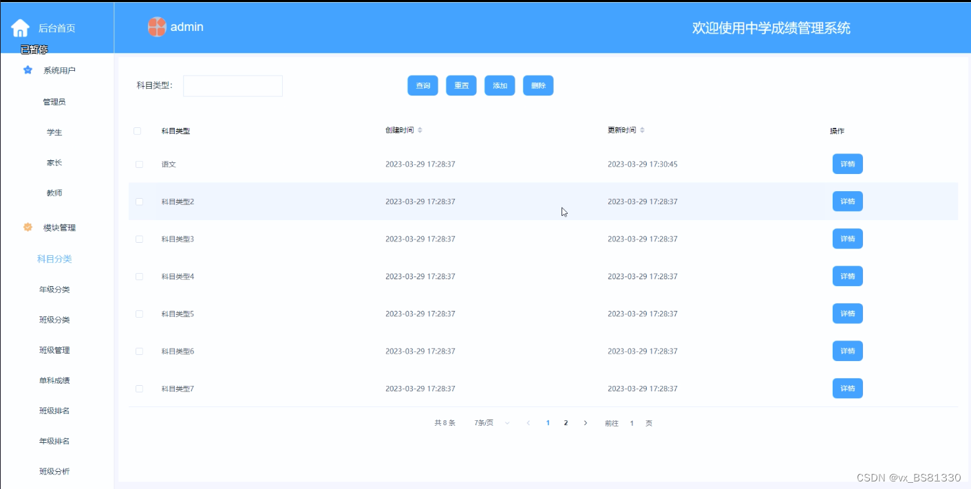 (4)单科成绩:点击“单科成绩”这个菜单,可以查看到系统中所有添加的单科成绩信息,支持通过教学年级或者教学班级对单科成绩信息进行查询,如果想要了解某一单科成绩的详细信息,点击后面的“详情”会进入详情界面;