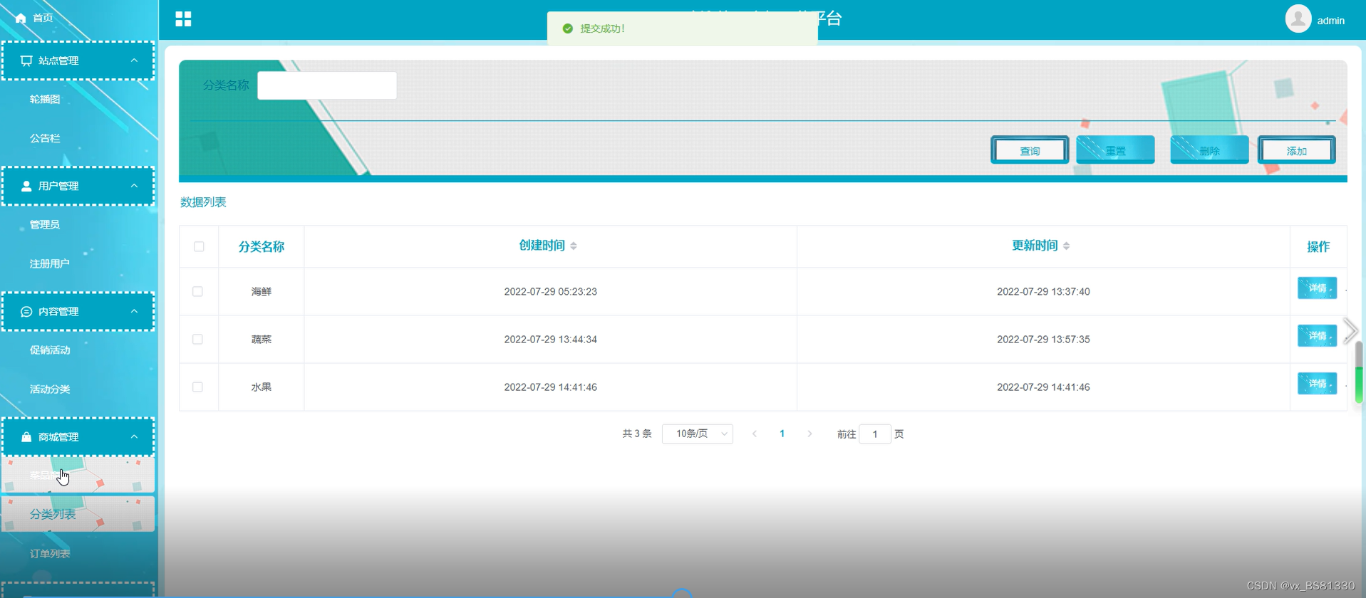 在管理员功能页面可以查看管理员:首页、站点管理(轮播图、公告栏)用户管理(管理员、注册用户)内容管理(促销活动、活动分类)商城管理(菜品商城、分类列表、订单列表)更多管理(订单物流、订单售后)等内容进行相对应操作,如图5-9所示。