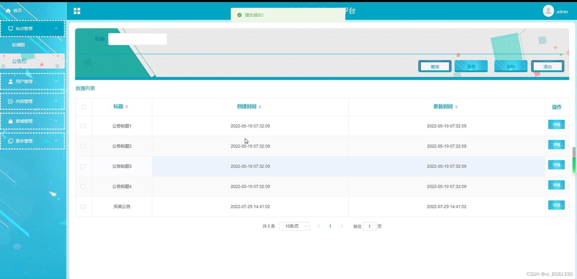公告信息管理,在公告信息管理页面可以查看索引、公告标题、类型、图片、发布日期等信息,并可根据需要进行查看评论、修改或删除操作,如图5-11所示。