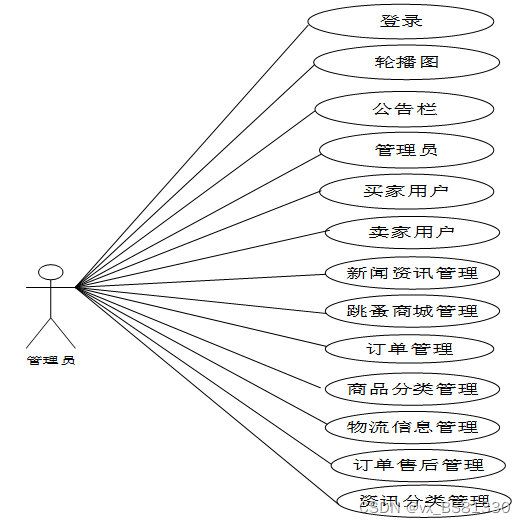 web后台管理上的管理员是维护整个跳蚤市场网络商城中所有数据信息的。管理员角色用例如图2-5所示。