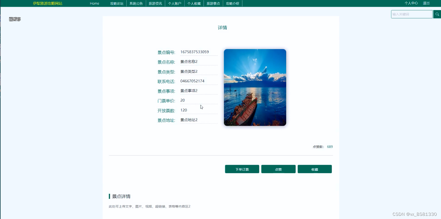 用户可以查看旅游景点,在查询到自己想要了解的旅游景点的时候,可以进入查看详细的介绍,点击“下单订票”这一按钮以后会跳转到下单订票信息填写的界面,根据提示填写好下单订票的信息,点击“提交”以后订票就完成了,在旅游景点详情这个界面,同时支持用户对喜欢的旅游景点进行收藏、点赞、评论的功能,旅游景点详情展示页面如图4-6所示。