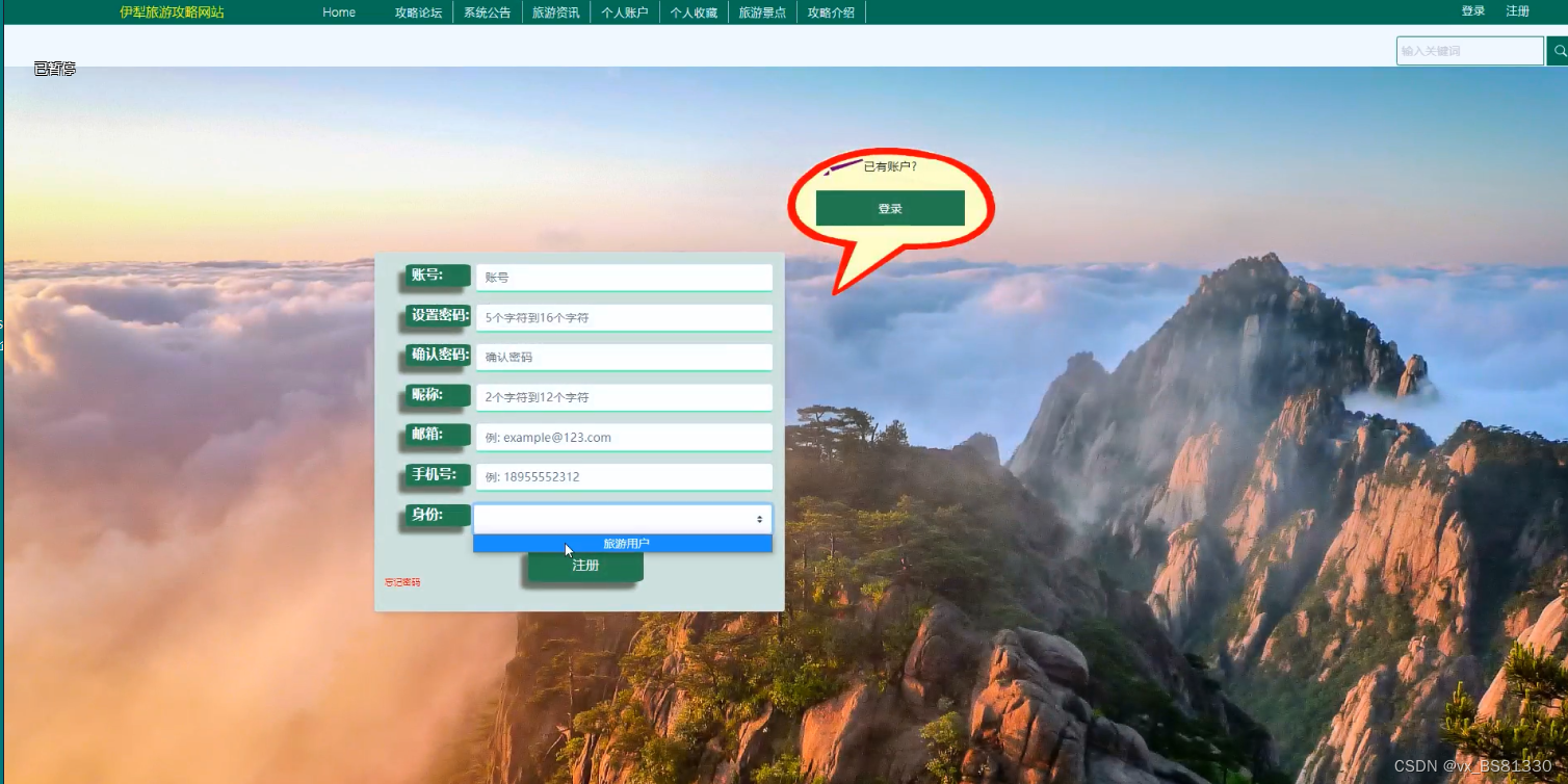 (1)用户注册登录:用户注册为旅游用户并登录伊犁旅游攻略网站;用户对个人信息的增删改查,比如个人资料,密码修改。