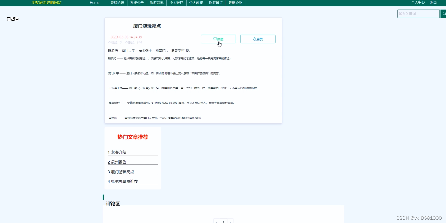 (4)旅游资讯:在首页导航栏上我们会看到“旅游资讯”这一菜单,我们点击进入进去以后,会看到所有管理员在后台发布的旅游资讯信息,能够对喜欢的旅游资讯进行点赞,如果下次想要更快的找到这篇资讯,也可以进行收藏、评论;