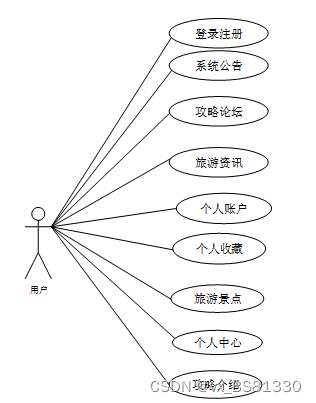 通过2.3功能的分析,得出了本伊犁旅游攻略网站的用例图: