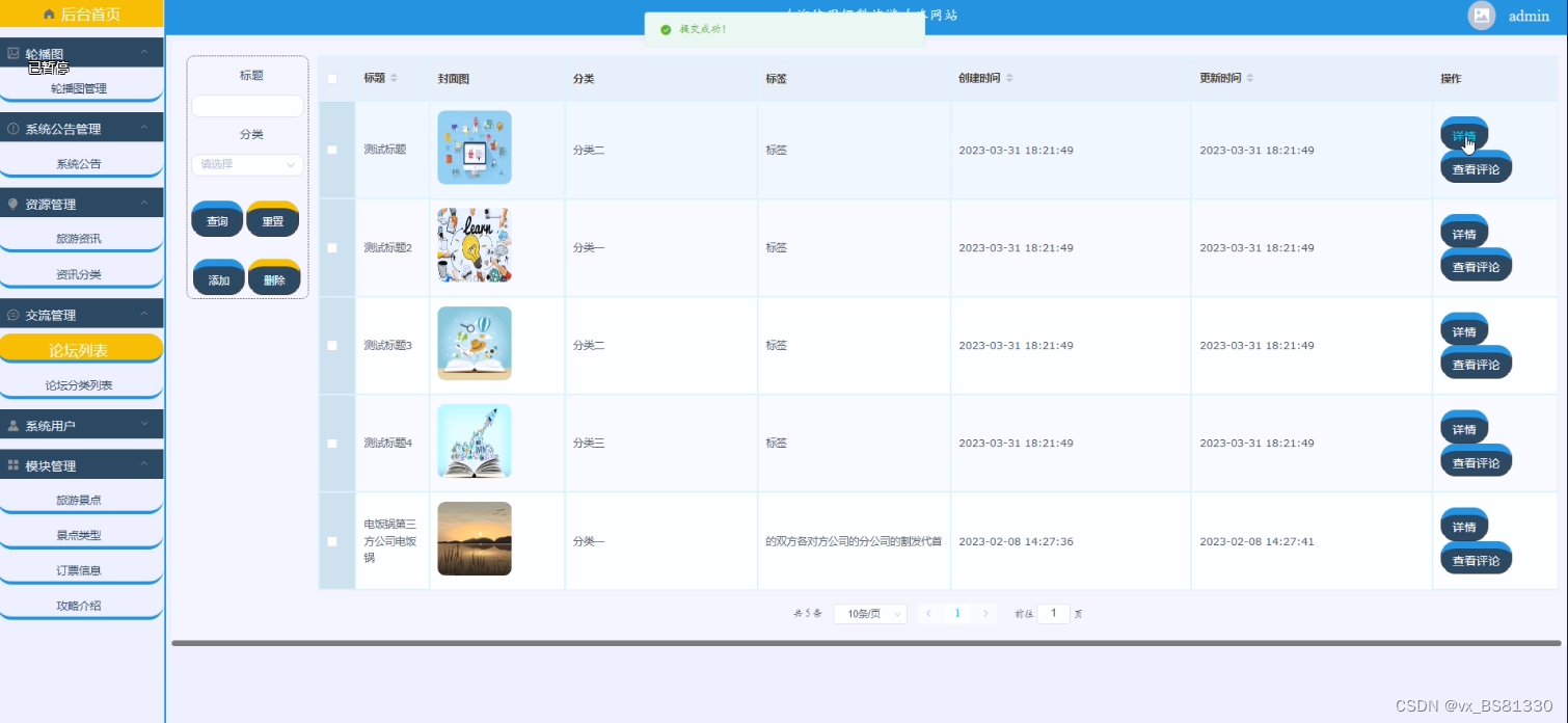 (4)交流管理:当点击“交流管理”这一菜单的时候,会出现论坛列表+论坛分类列表这两个子菜单,能够对用户在前台提交的攻略论坛进行管理,同时对前台展示的攻略论坛进行增删改查操作;