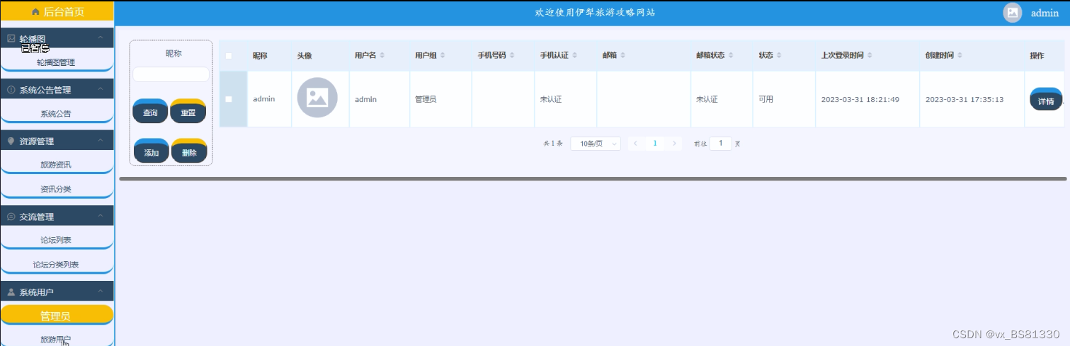 (3)系统用户:当点击“系统用户”这一菜单的时候,会出现管理员+旅游用户两个子菜单,可以对这两个模块进行增删改查操作;