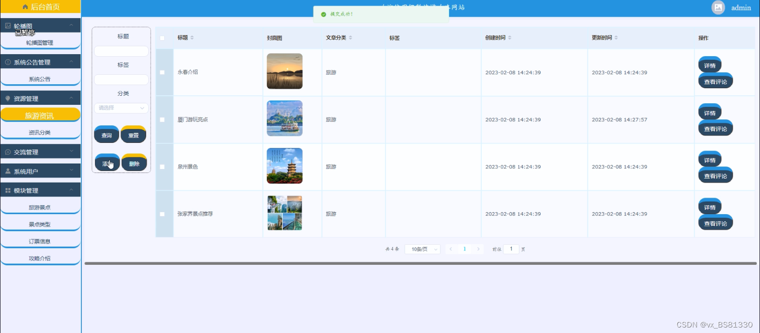 (2)资源管理:当点击“资源管理”这一菜单的时候,会出现旅游资讯+资讯分类这两个子菜单,可以对这两个模块进行增删改查操作;