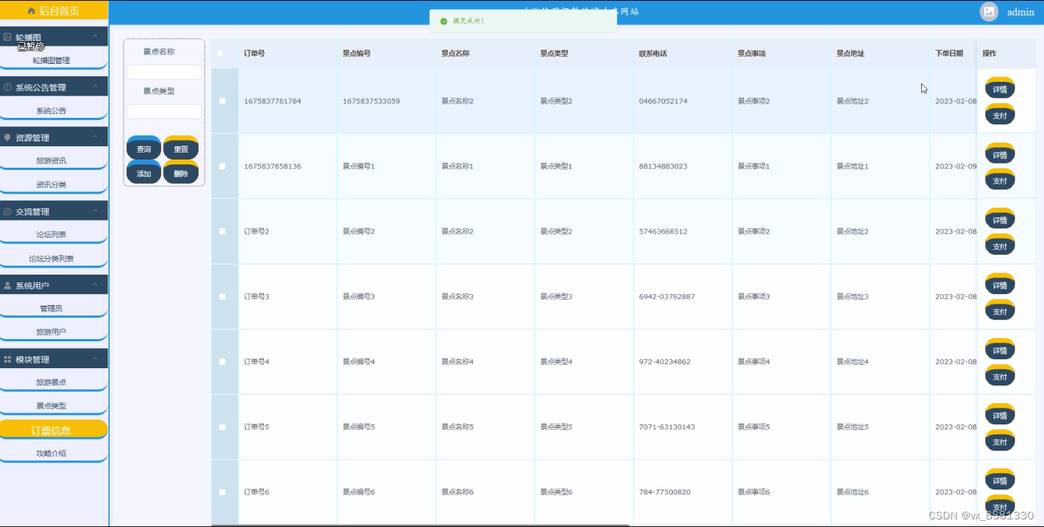 (5)模块管理:当点击“模块管理”这一菜单的时候,会出现旅游景点+景点类型+订票信息+攻略介绍四个子菜单,可以对这四个模块进行增删改查操作;