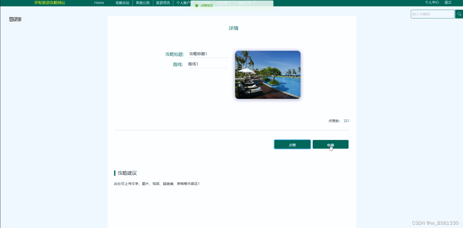 用户可以查看攻略介绍信息,在查询到自己想要了解的攻略介绍的时候,可以进入查看详细的介绍,支持用户对喜欢的攻略介绍进行收藏、点赞的功能。攻略介绍详情界面如下图4-5所示。