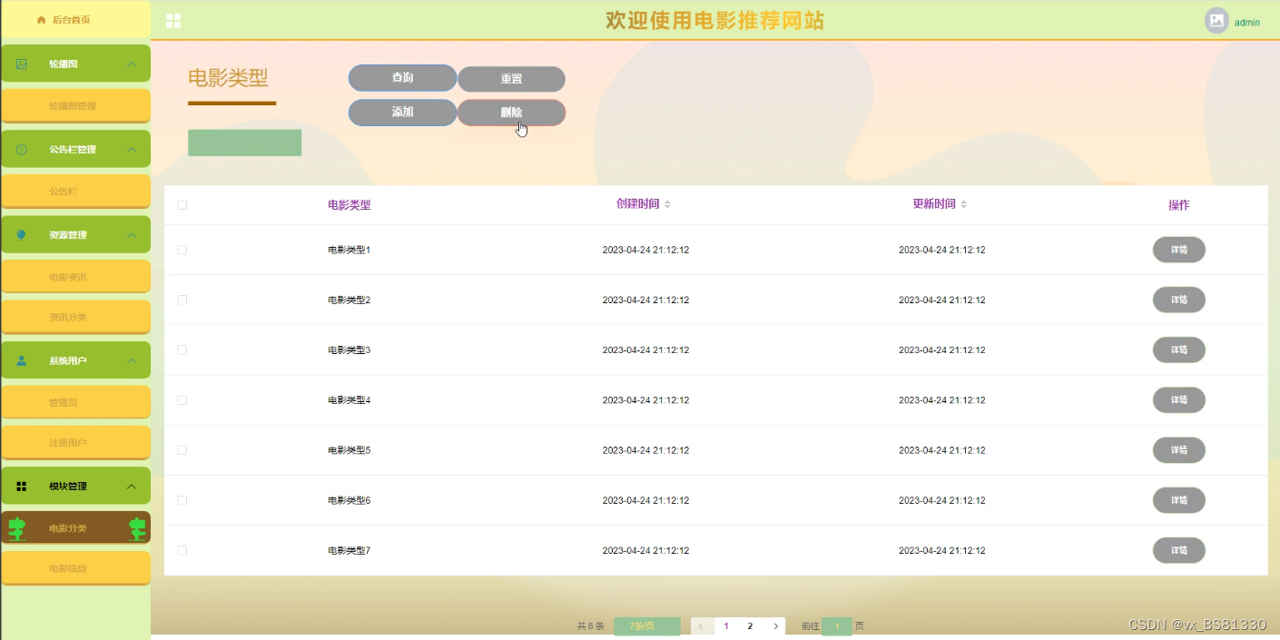系统设计主要是管理员登录后对整个系统相关操作进行处理,可进行管理员的添加和删除,首页、轮播图(轮播图管理)、公告栏管理(公告栏)、资源管理(电影资讯、资讯分类)、系统用户(管理员、注册用户)、模块管理(电影分类、电影信息)、个人中心等操作管理。