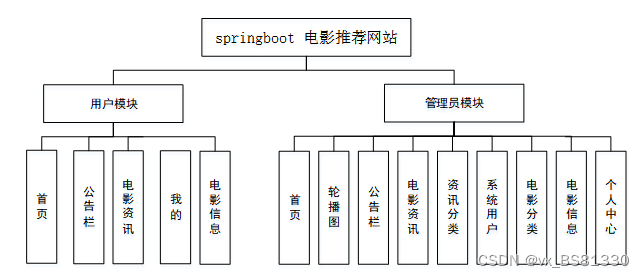 本系统主要包含了首页、轮播图(轮播图管理)、公告栏管理(公告栏)、资源管理(电影资讯、资讯分类)、系统用户(管理员、注册用户)、模块管理(电影分类、电影信息)、个人中心等多个功能。不同的权限对应相应的功能模块的需求,管理员权限的级别是最高的,所以所对应的需求是最多的。