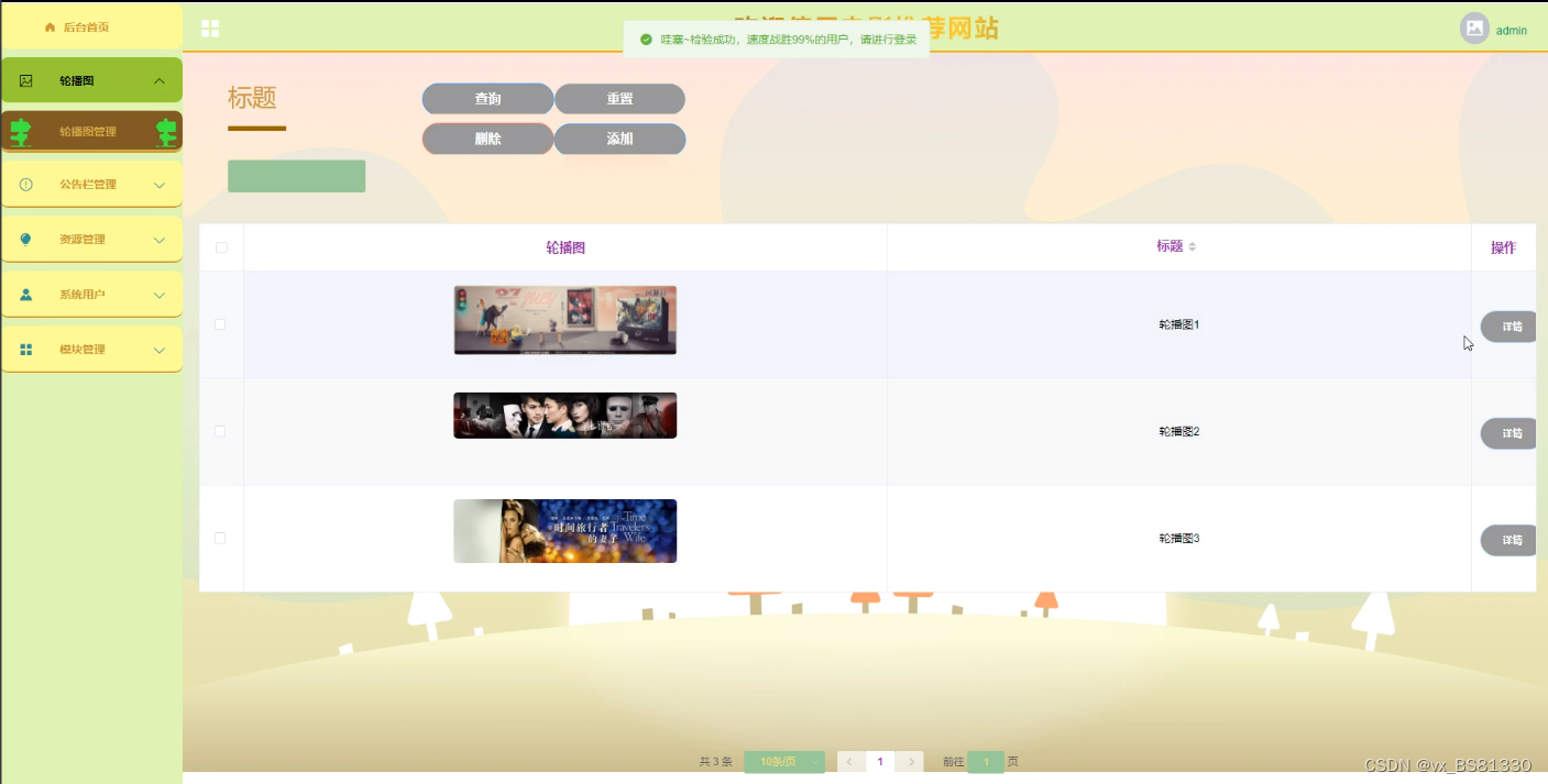 轮播图管理,在轮播图管理页面中可以查看索引标题、轮播图等信息,并可根据需要进行详情、修改、或删除等操作,如图5-8所示。