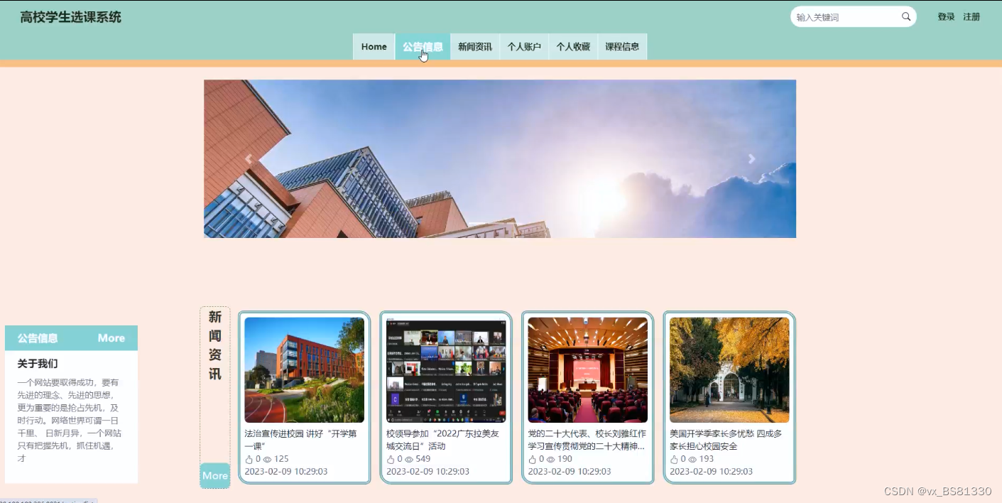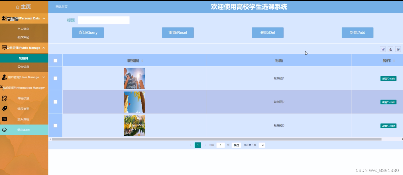(2)公共管理:管理员可以对系统前台展示的轮播图+公告信息进行增删改查,方便用户进行查看。