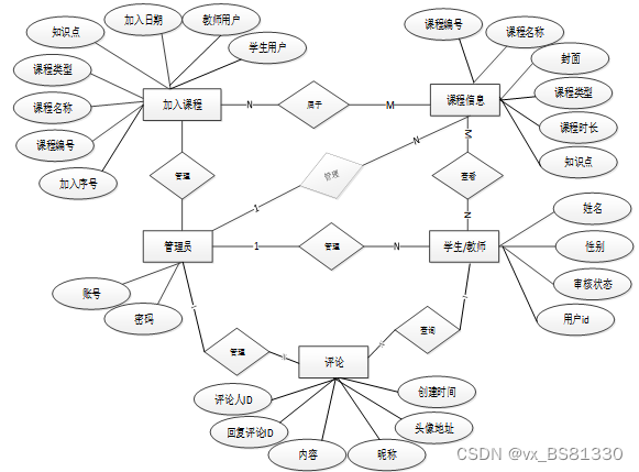 (5)课程信息:管理员点击“课程信息”会显示出所有的课程信息,支持输入课程编号或者课程名称对课程信息进行查询,如果想要添加新的课程信息,点击“添加”按钮,输入课程编号、课程名称、封面、课程类型、知识点、剩余人数等信息,点击“提交”按钮就可以添加了,同时可以选择某一条课程信息,点击“删除”进行删除,也可以对用户提交的课程信息评论的信息进行管控;