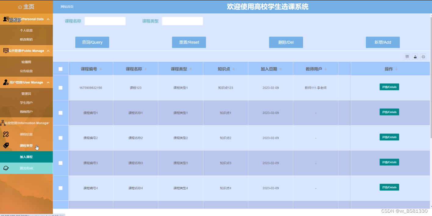 (6)加入课程:管理员点击“加入课程”会显示出所有的加入课程信息,支持通过课程编号或者课程名称对加入课程信息进行查询,如果想要添加新的加入课程信息,点击“添加”按钮,输入相关信息,点击“提交”按钮就可以添加了,同时可以选择某一条加入课程信息,点击“删除”进行删除。