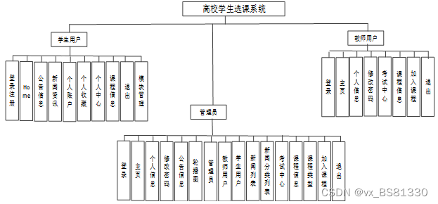 按照高校学生选课系统的角色,我划分为了学生用户、教师用户以及管理员管理这三大部分。