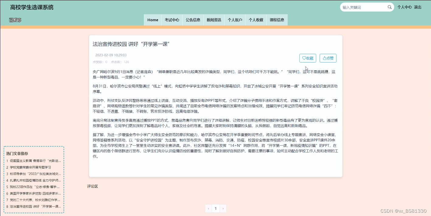 当访客点击高校学生选课系统中导航栏上的“新闻资讯”后将会进入到该“新闻资讯”列表的界面,然后选择想要看的新闻资讯信息,点击进入到详细界面,在详细界面可以收藏+赞+评论等操作,新闻资讯界面如下图4-4所示。