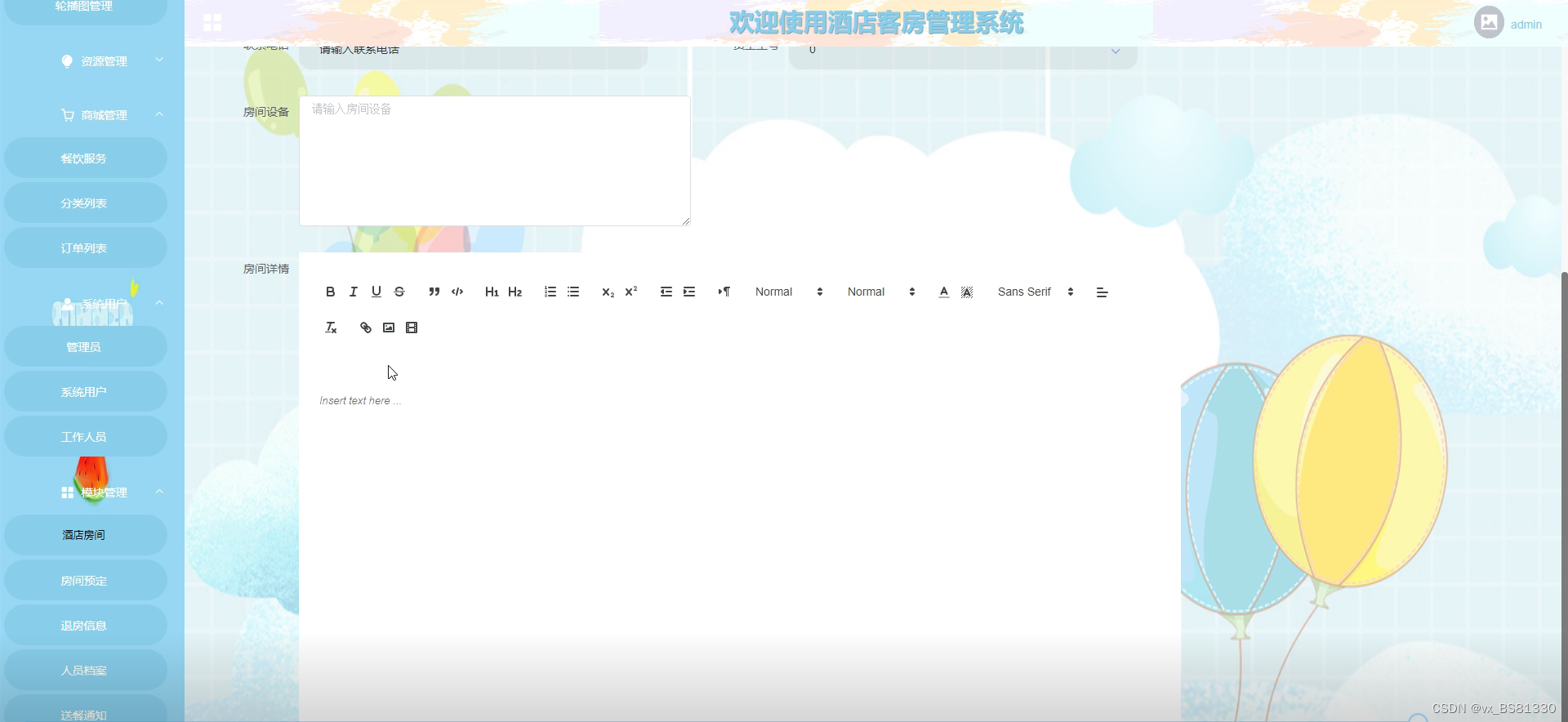 房间信息管理:对房间信息进行维护,添加、删除、修改信息。