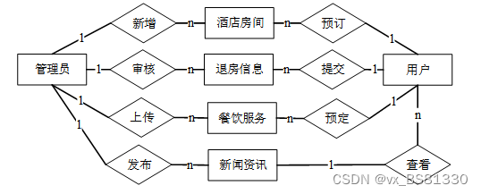 酒店客房管理系统的功能主要分为前台用户根据自己的需求进行注册登录,浏览房间信息并对需要的房间进行预订操作。后台系统管理员因职责的不同,分为普通管理员和超级管理员,管理员主要对注册用户,新闻资讯,房间信息,房间预订单,房间退定进行处理。