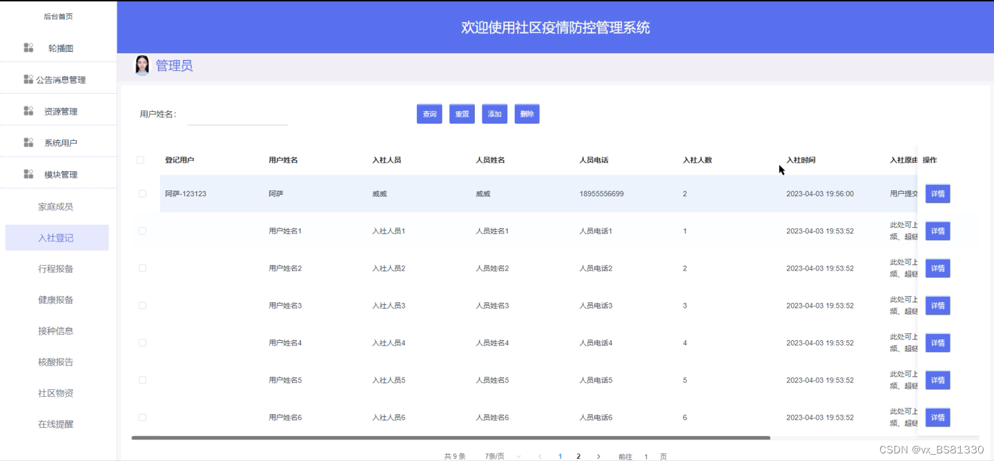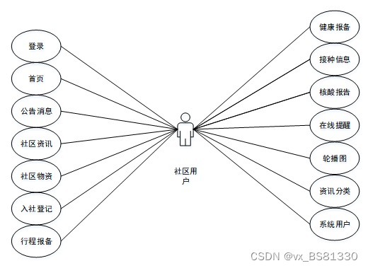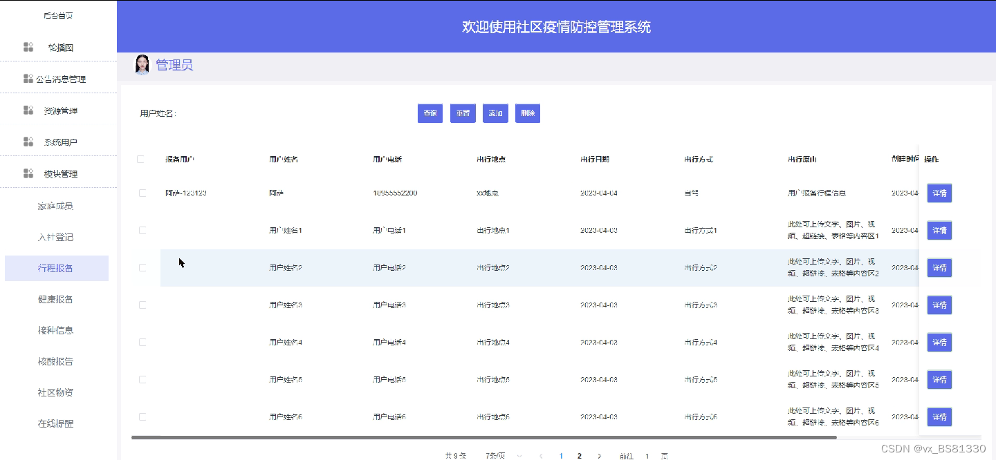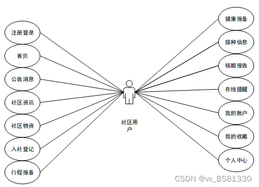 社区疫情防控管理系统的功能主要分为前台用户根据自己的需求进行注册登录,浏览检测机构信息并对选中的检测机构进行核酸预约操作。后台系统管理员因职责的不同,管理员主要对注册用户,入社登记、行程报备、健康报备、家庭成员、接种信息、核酸报告、在线提醒等进行处理。
