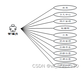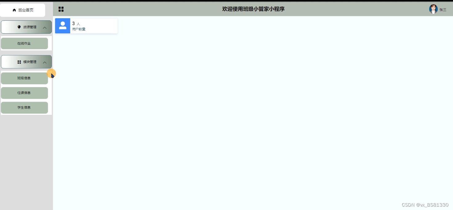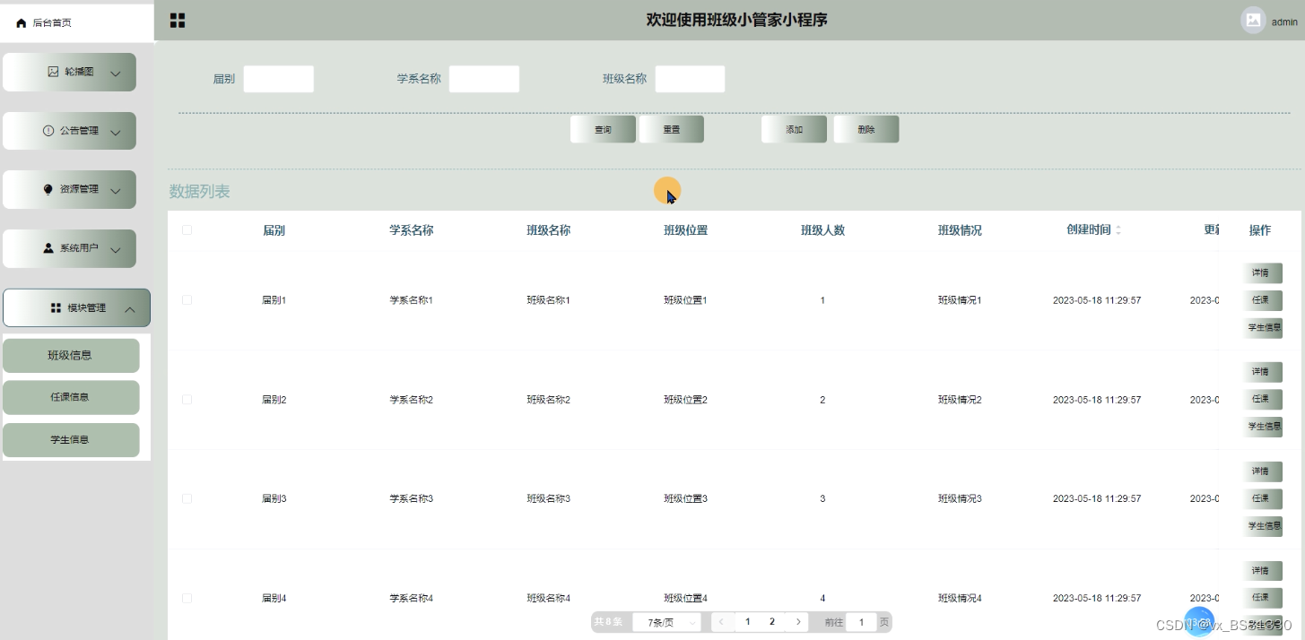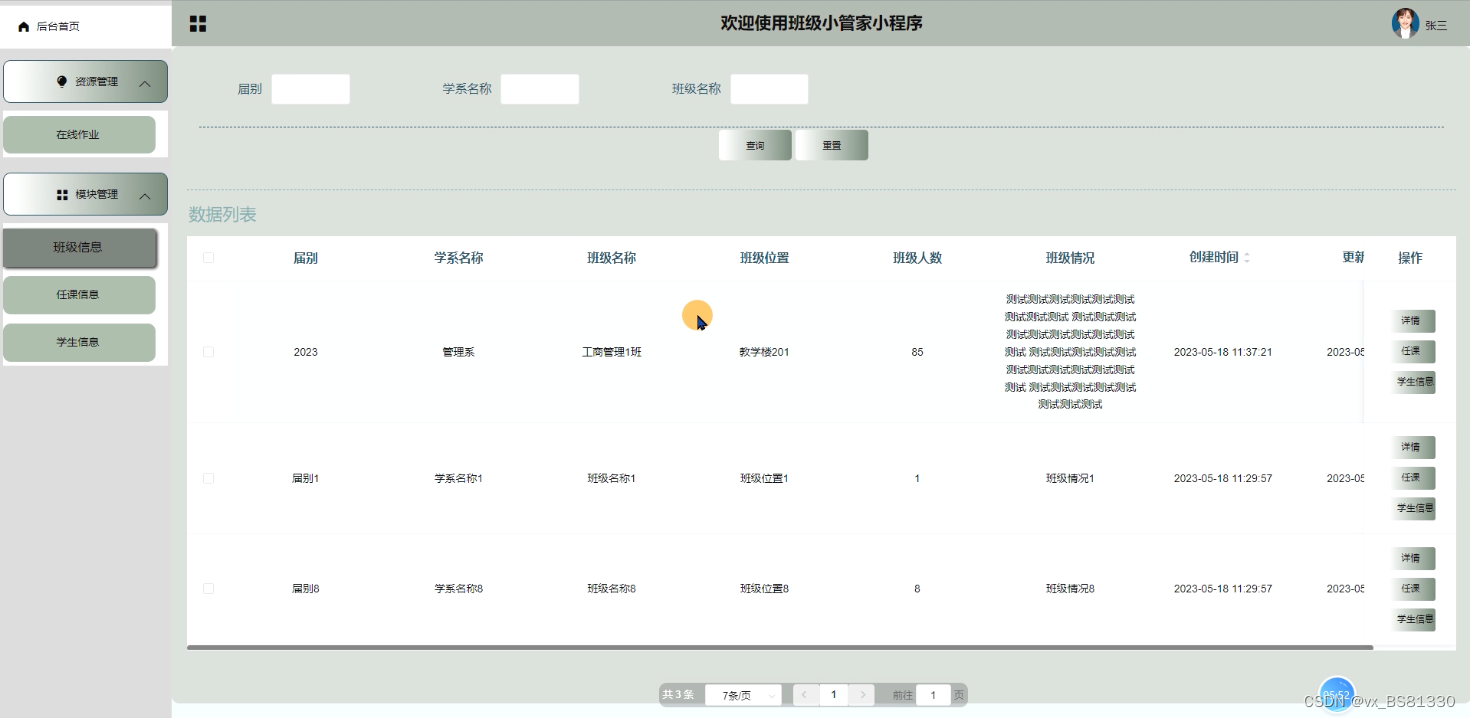 通过管理员功能页面,用户可以查看首首页、轮播图、公告、资源管理(学校资讯、资讯分类、在线作业)系统用户(管理员、教师用户、学生用户)模块管理(班级信息、任课信息、学生信息)等,并且可以根据需要进行相应的操作,如图5-8所示。