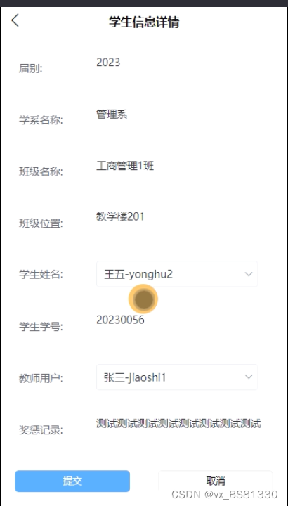 学生信息管理页面,管理员可以添加学生的详细信息、学生信息将展示在系统前台及小程序端方便用户查看,并且可以根据信息需求进行调整,如图5-9所示。