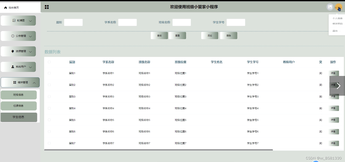班级信息页面,用户可以轻松获取有关班级的详细信息,还可以通过关键字快速搜索,同时还可以进行班级添加提交等功能等,并且可以根据需要进行相应的操作,如图5-6所示。