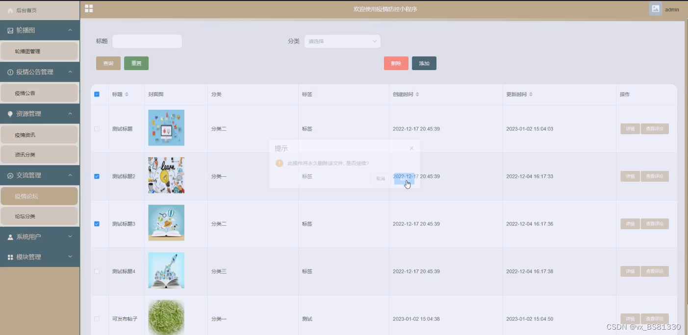 疫情防控小程序中的管理人员在“交流管理”这一菜单中是可以对疫情防控小程序内的疫情论坛、论坛分类信息进行维护和管理的,界面如下图5-8所示。