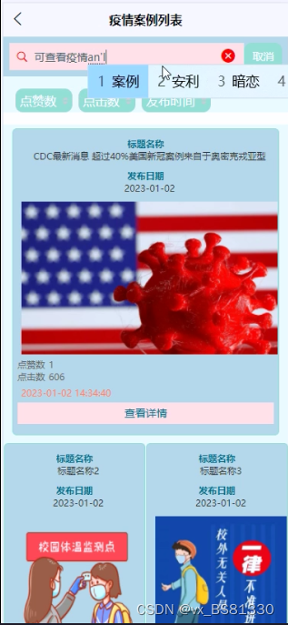 疫情案例列表页面可以查看展示的疫情案例详情等信息,并可通过关键词搜索疫情案例,并对疫情案例点赞、评论、收藏等操作。如图5-4所示。