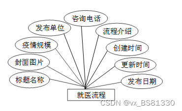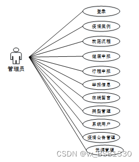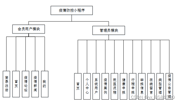 基于疫情防控小程序 基于现有的手机,可以实现管理员,首页、系统用户、疫情案例、就医流程、健康申报、行程申报、举报信息、在线留言、类型管理等详细的了解及统计分析。根据系统功能需求建立的模块关系图如下图: