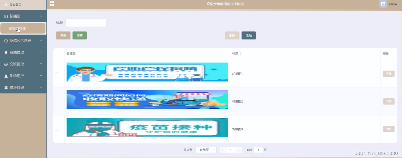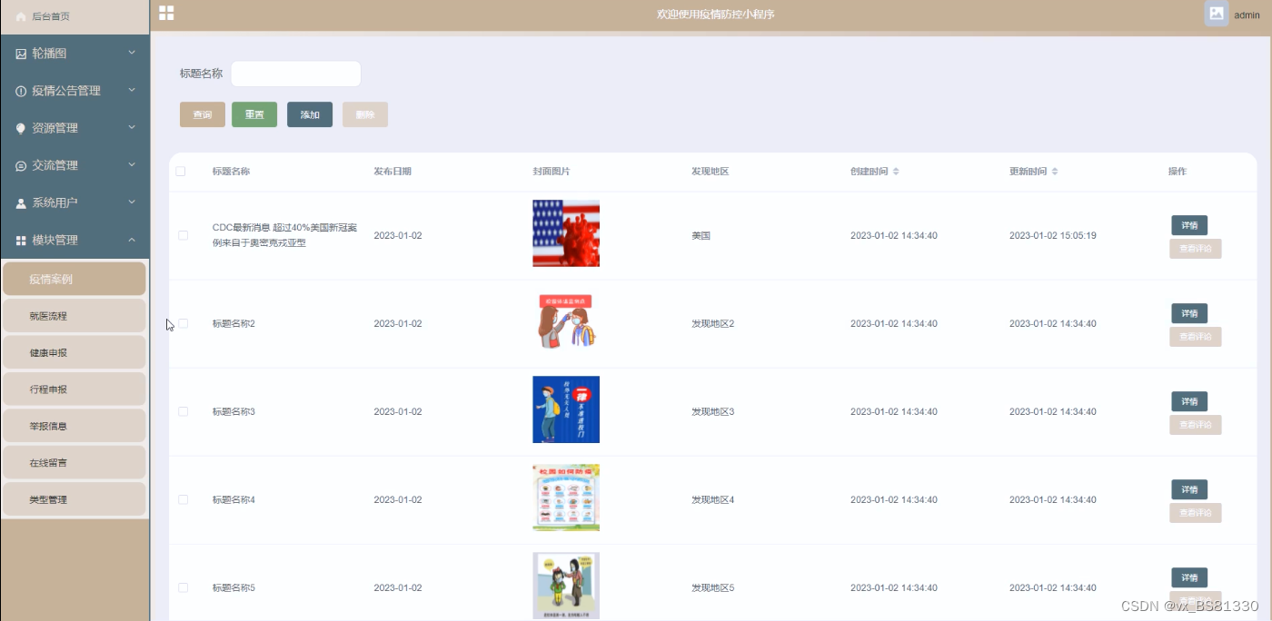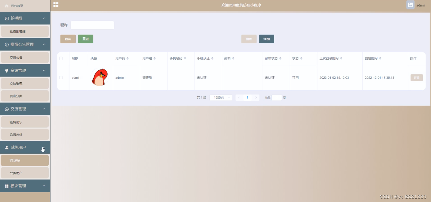 With the rapid development of China's economy, people's demand for mobile phones is increasing, and various mobile phone software are also widely used. However, data information management for mobile phones and various software for mobile phones are also popular with users, and epidemic prevention and control applets are widely used by users. In order to facilitate users to manage the data information of epidemic prevention and control applets at any time, A management system based on epidemic prevention and control procedures has been developed.