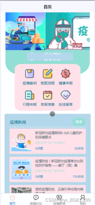 首页,可以进行首页、疫情论坛、疫情新闻、我的等功能模块的查看与操作,如图5-3所示。