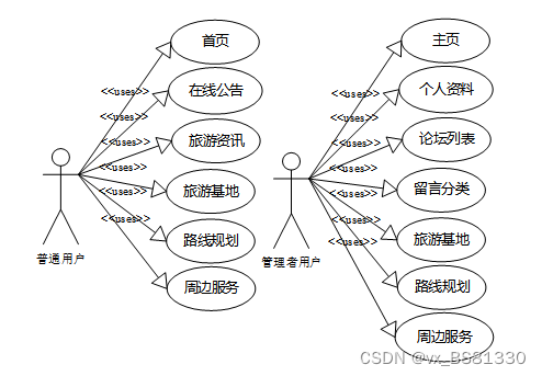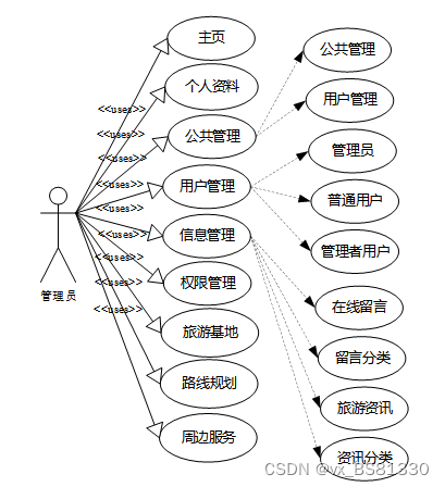 (1)功能要求:可以管理主页,个人资料,公共管理(轮播图,在线公告),用户管理(管理员,普通用户,管理者用户),信息管理(在线留言,留言分类,旅游资讯,资讯分类),权限管理(权限列表),旅游基地,路线规划,周边服务等功能模块。