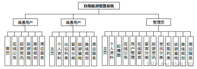 The main users of the self-service tourism management system are divided into administrators, manager users, and ordinary users. The functions include: homepage, personal information, public management (broadcast maps, online announcements), user management (administrators, ordinary users, manager users), information management (online messages, message classification, tourism information, information classification), permission management (permission list), tourism base, and route planning, Peripheral services and other functions. It can improve the efficiency of tourism planning.