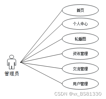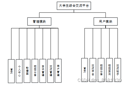 基于大学生综合交流平台的设计,可以实现首页、轮播图、校园公告、资源管理(校园资讯、资讯分类)交流管理(交流帖子、交流分类)系统用户(管理员、会员用户)等详细的了解及统计分析。根据系统功能需求建立的模块关系图如下图: