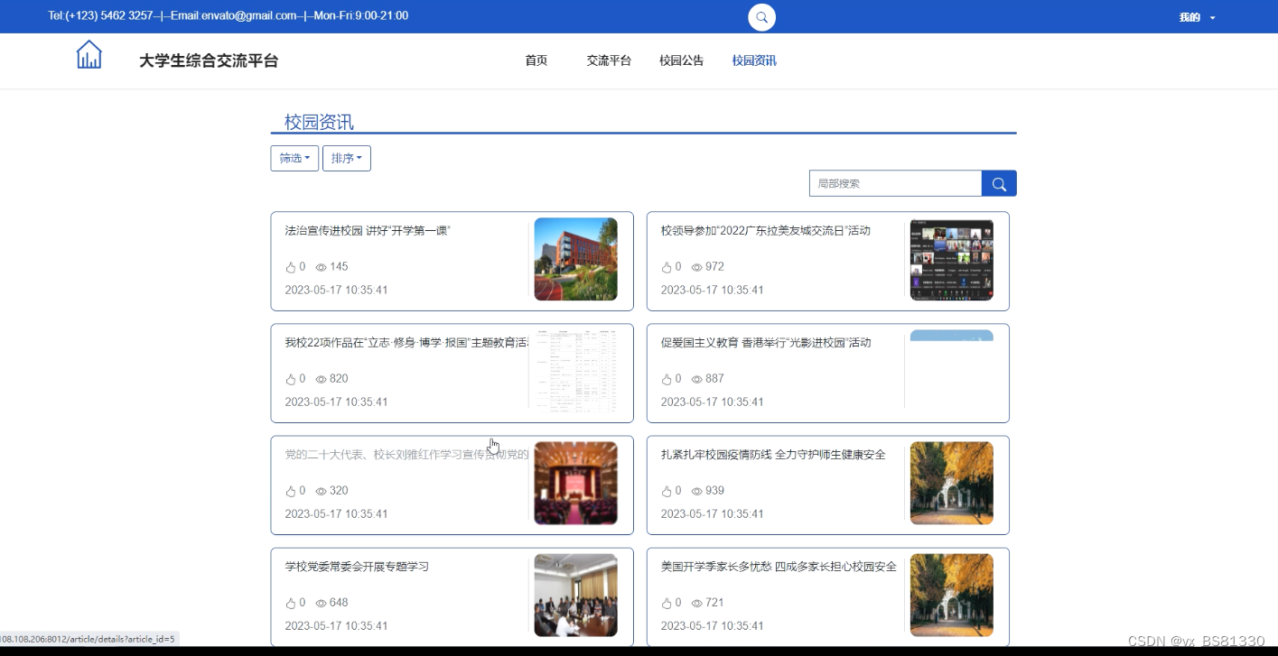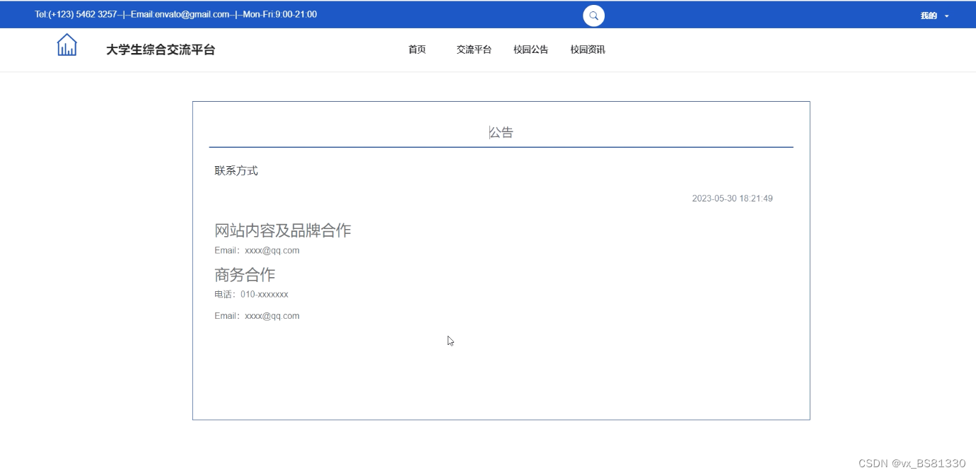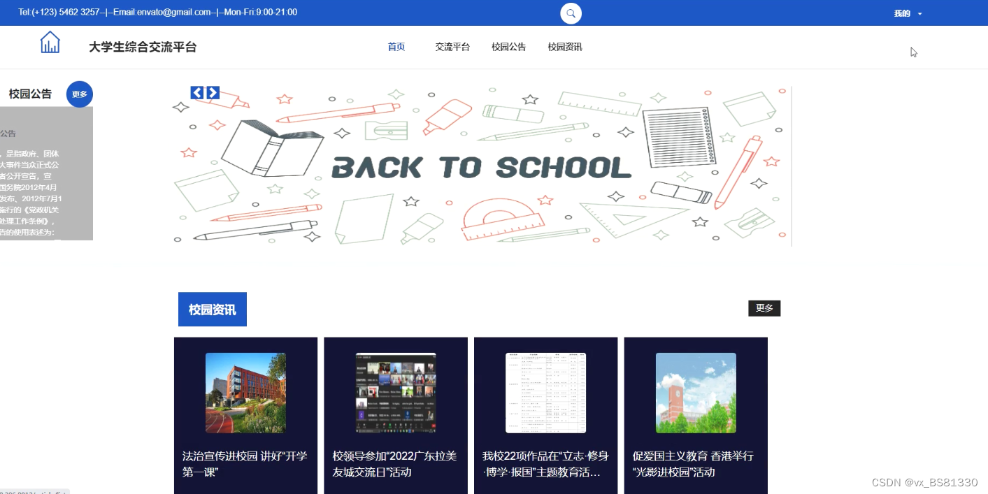 近年来,随着我国经济的不断发展,平台的管理制度越来越多。每个大学生综合交流平台也都将通过计算机进行整体智能化操作,对于大学生综合交流平台功能所牵扯的数据都是通过用户进行大学生综合交流平台等相关的数据信息内容、并且可以进行管理员在线处理选择首页、轮播图、校园公告、资源管理(校园资讯、资讯分类)交流管理(交流帖子、交流分类)系统用户(管理员、会员用户),可以通过系统进行分配,传统的交流方式信息已经无法满足用户的需求。为此开发了本大学生综合交流平台 ,为用户提供一个基于大学生综合交流平台,该系统满足了用户对大学生综合交流平台信息获取的需求,并且信息可以及时、准确、有效地进行查看并且系统化、标准化和有效的工作。