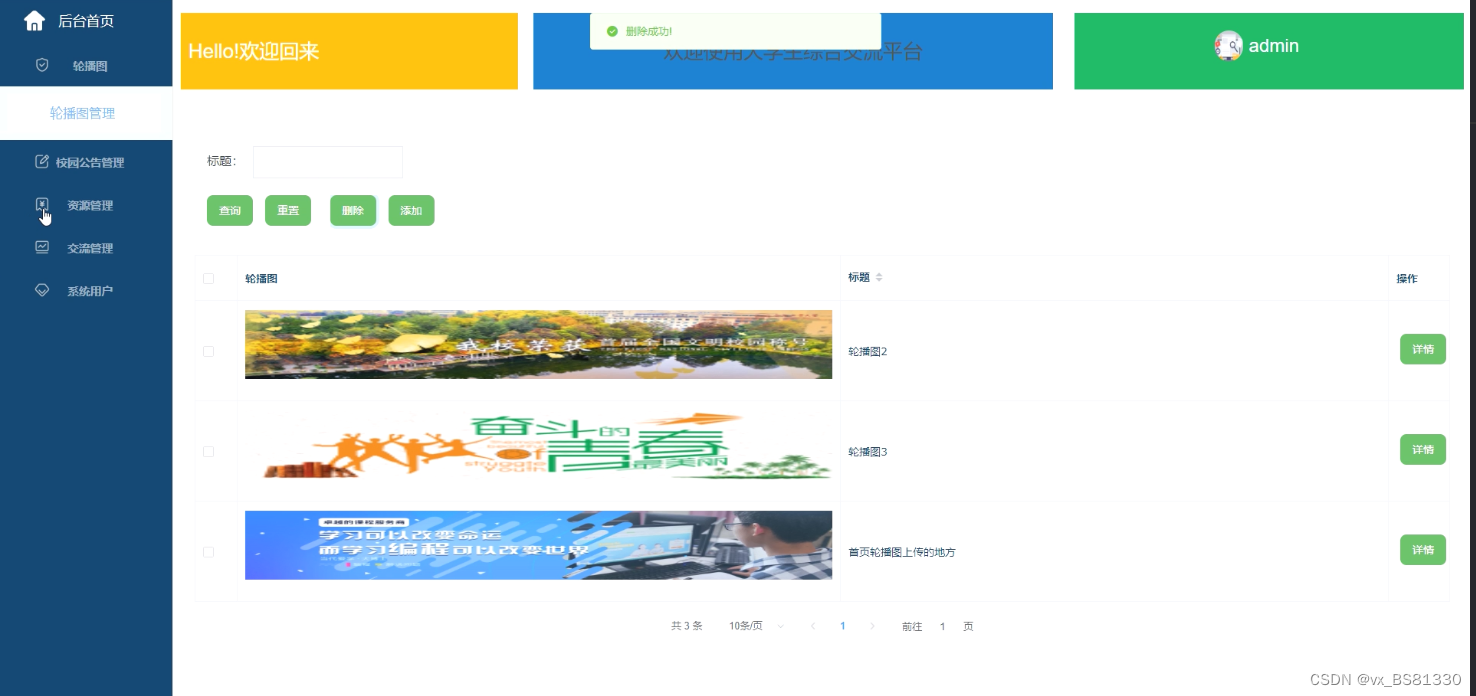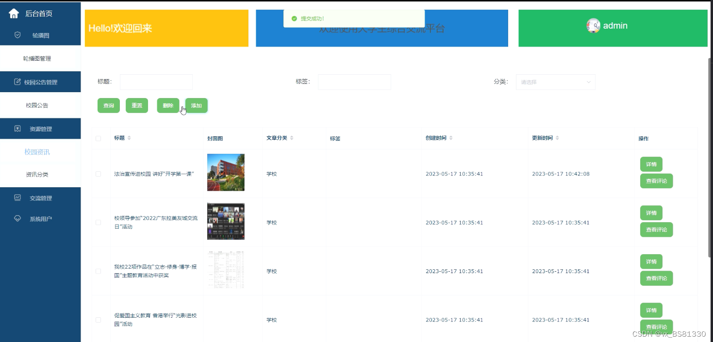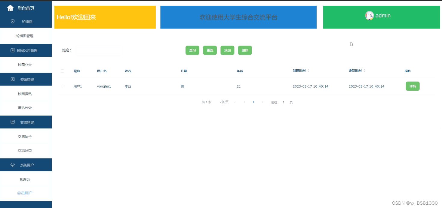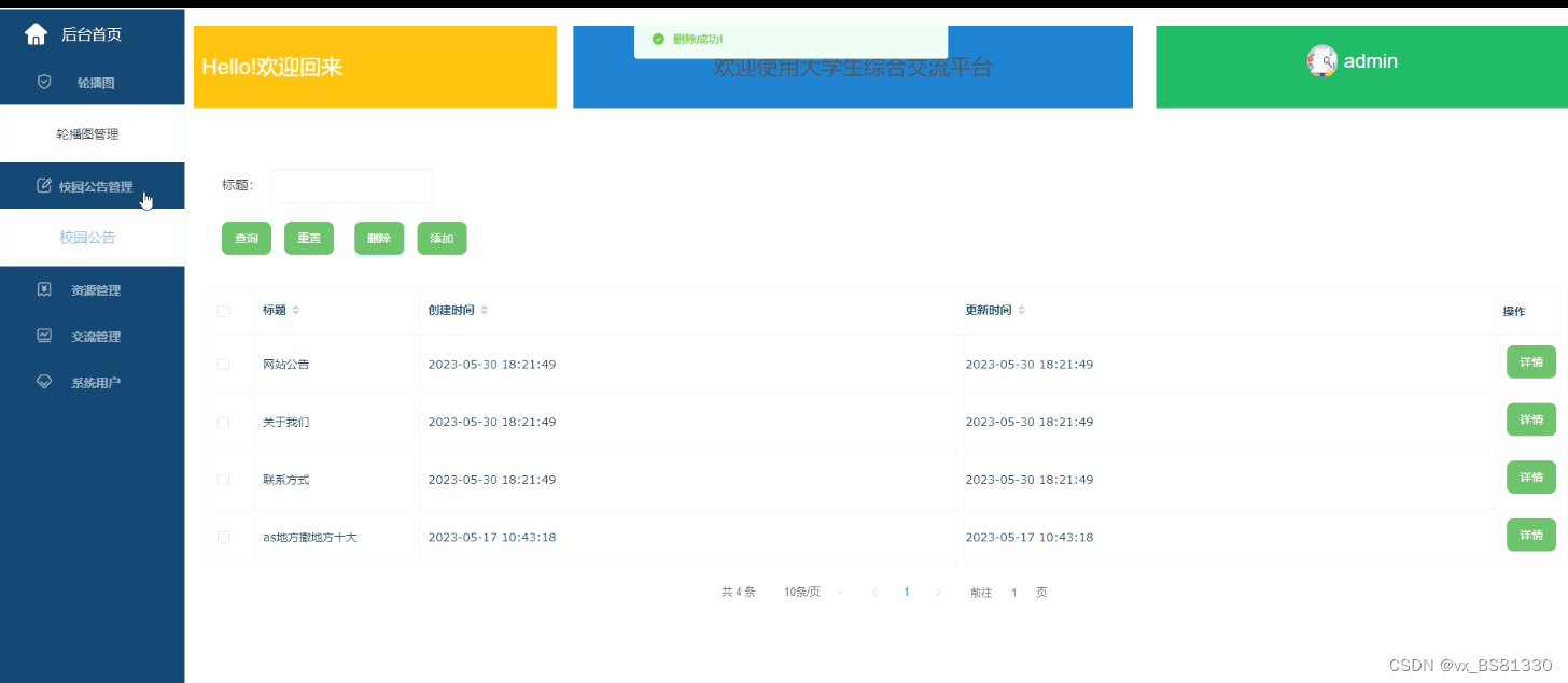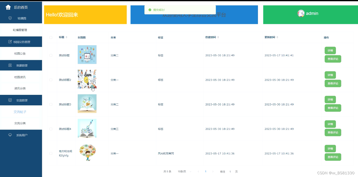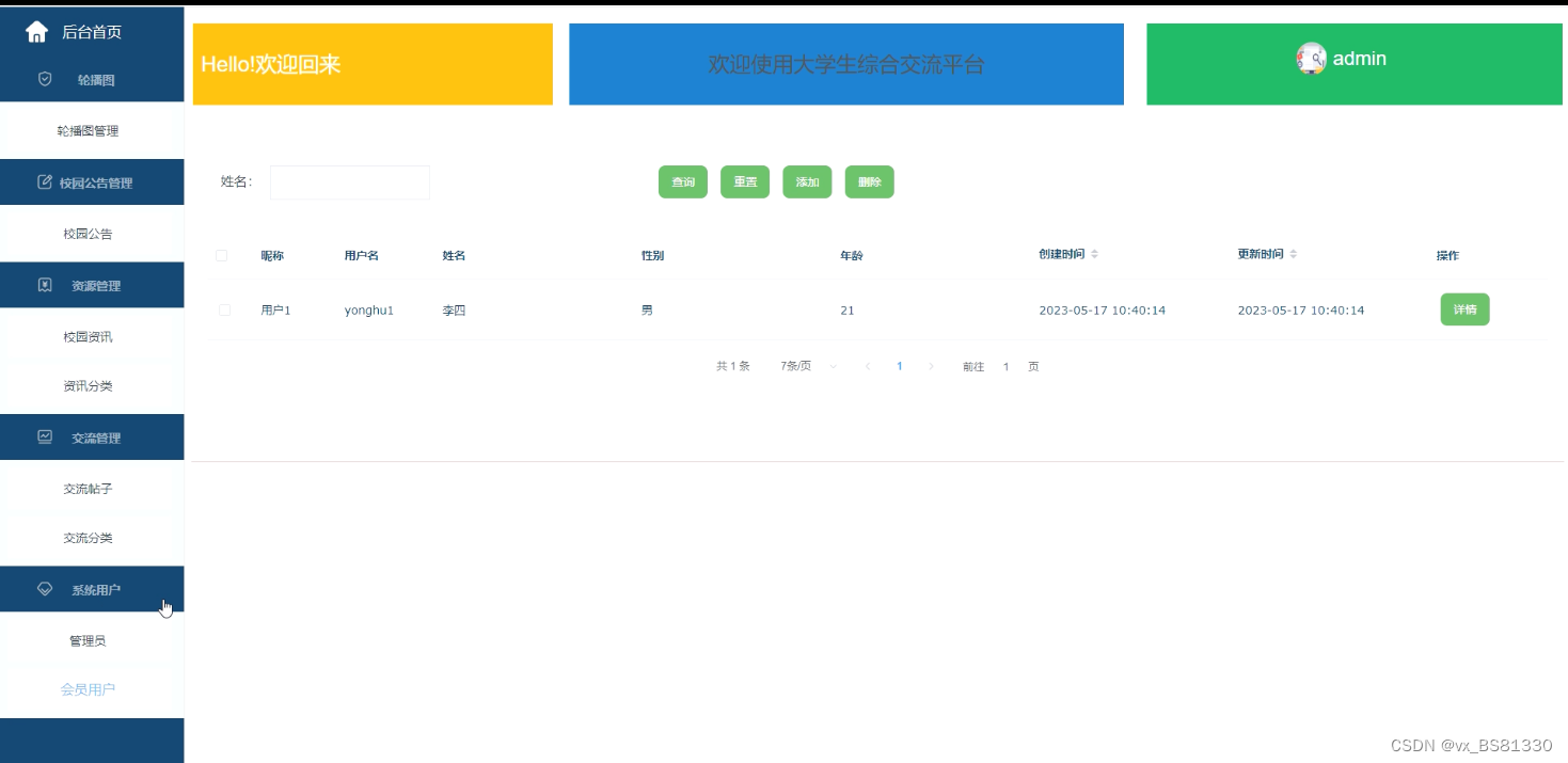 用户通过登录进入到系统操作界面后,可以根据需求对首页、轮播图、校园公告、资源管理(校园资讯、资讯分类)交流管理(交流帖子、交流分类)系统用户(管理员、会员用户)等模块进行管理维护操作。