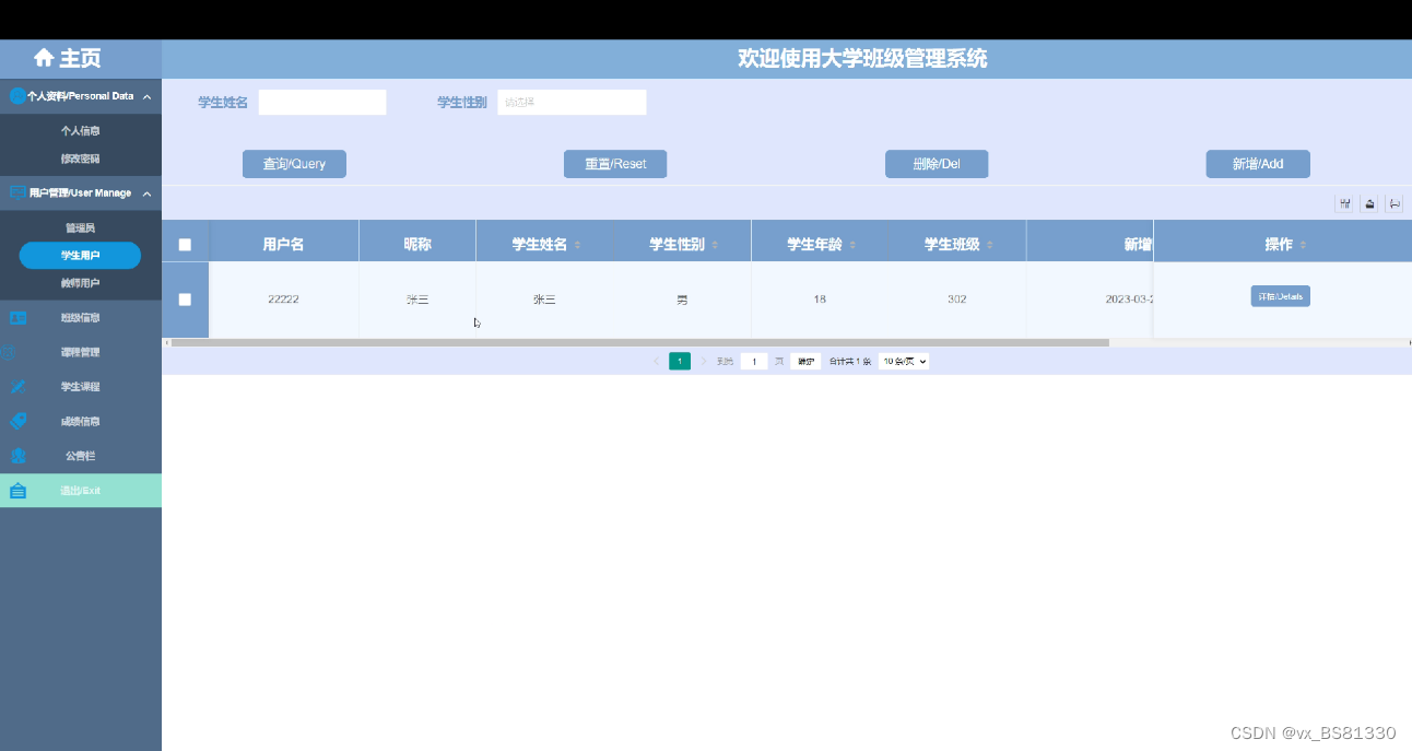 用户管理-学生用户,在此界面图可添加从学生用户信息内容:用户名,昵称,学生姓名,性别,年龄,班级等信息,还可在此页面对进行重置,删除,新增等操作,如图5-5所示: