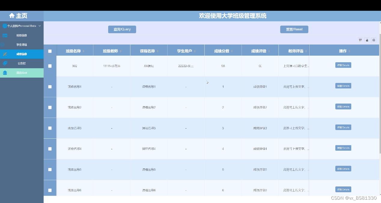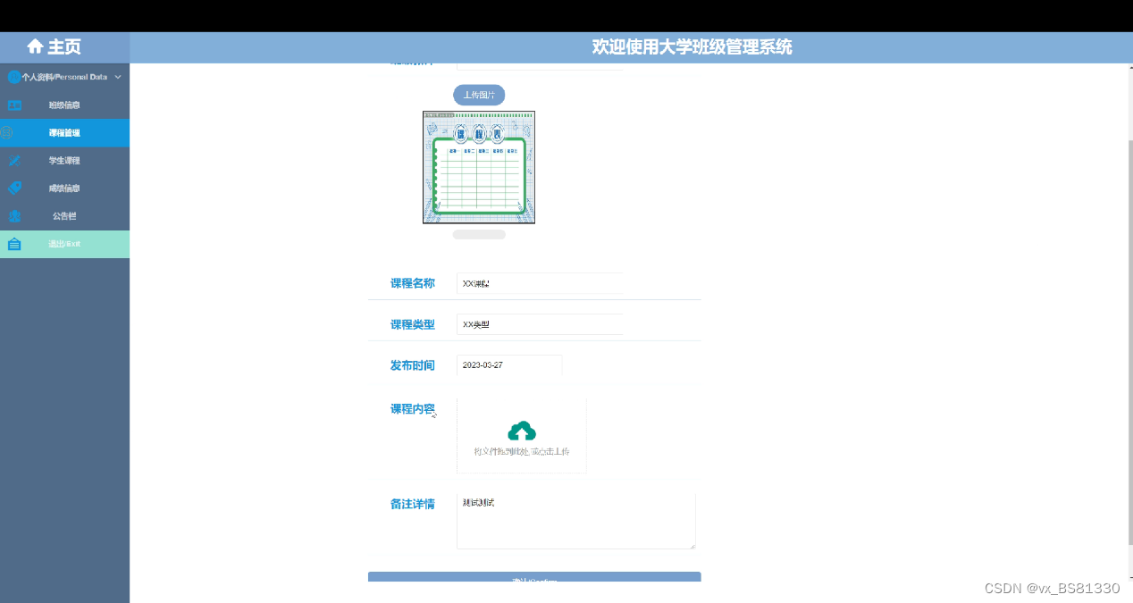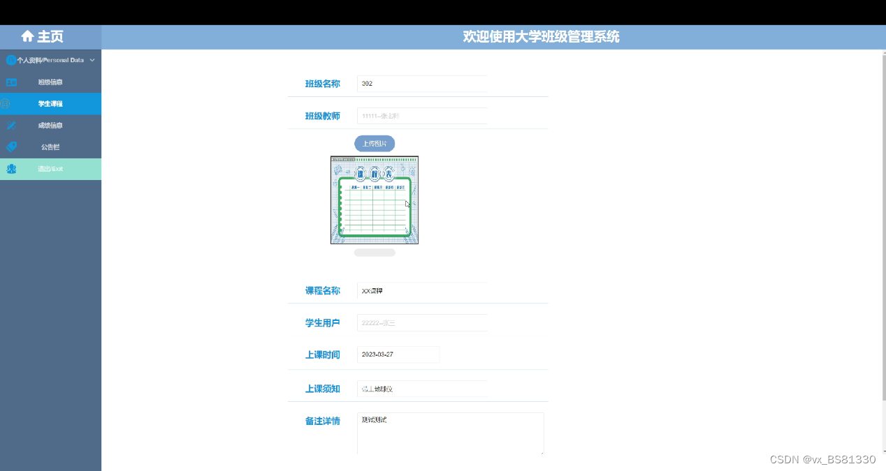 教师登录大学班级管理系统,后台功能为:主页,个人资料(个人信息,修改密码),班级信息,课程信息,学生课程,成绩信息,公告栏等功能,如下图所示:
