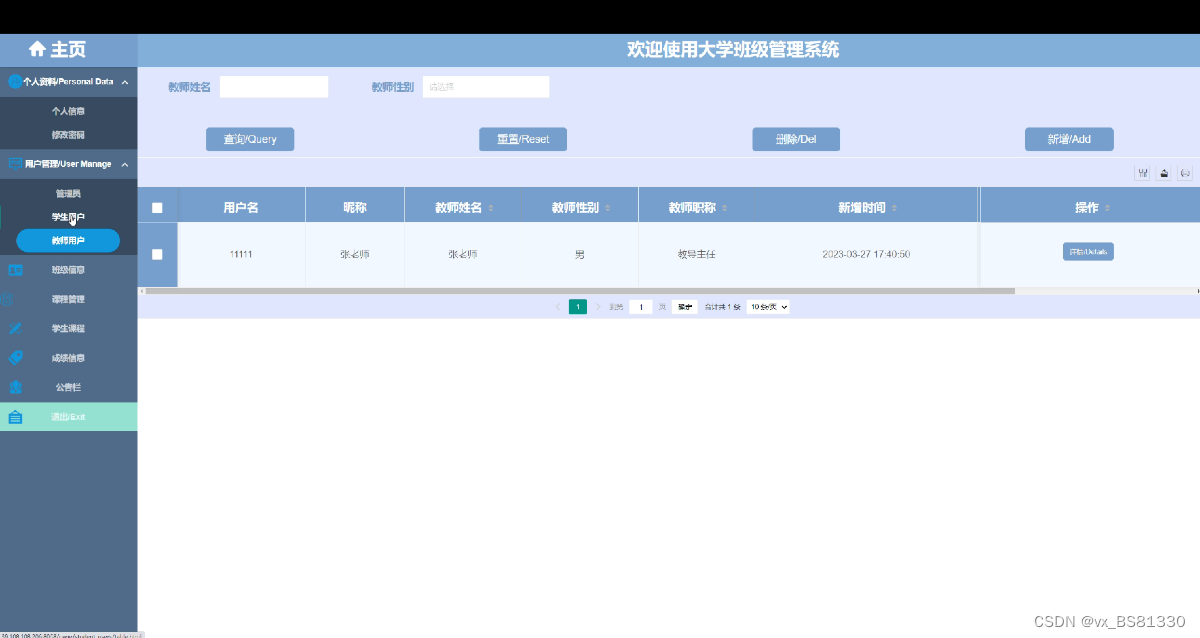 用户管理-教师用户,在此界面图可添加教师用户信息内容:用户名,昵称,教师姓名,性别,职称等信息,还可在此页面对进行重置,删除,新增等操作,如图5-4。