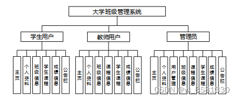 大学班级管理系统在对需求做解析后,整个系统主要分为管理员和教师用户,学生用户,每个模块下的分支功能不一样。管理员模块包括:主页,个人资料(个人信息,修改密码),用户管理(管理员,学生用户,教师用户),班级信息,课程信息,学生课程,成绩信息,公告栏;教师用户模块包括:主页,个人资料(个人信息,修改密码),班级信息,课程信息,学生课程,成绩信息,公告栏等模块。学生用户模块包括:主页,个人资料(个人信息,修改密码),班级信息,学生课程,成绩信息,公告栏等模块。