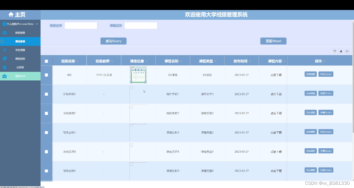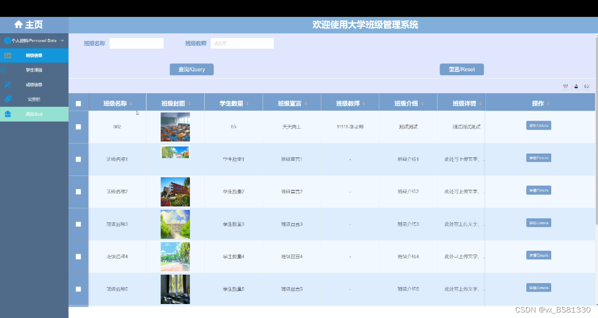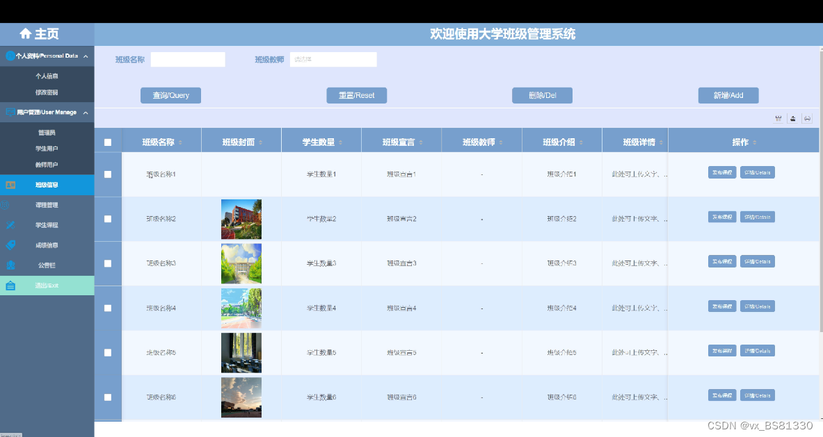 班级信息管理,在此页面图中可以查看信息:班级名称,班级封面,学生数量,班级宣言,教师等内容,还可在此页面对进行重置,删除,新增,发布课程等操作,如图5-6所示: