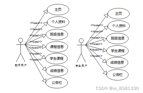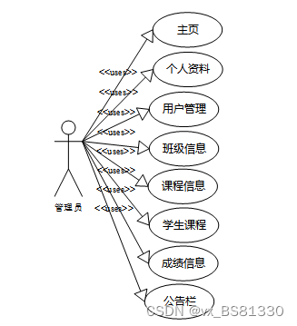 系统设计的目的是分析系统包括的所有功能结构,为开发人员设计开发和实现系统做好准备工作。经过前期的需求调查、分析和整理之后,确定的总体需求主要包括多个模块,分别是:主页,个人资料(个人信息,修改密码),用户管理(管理员,学生用户,教师用户),班级信息,课程信息,学生课程,成绩信息,公告栏。系统整体角色分为三个部分,一是管理员、二是教师用户、最后是学生用户。权限分布也是很明显,管理员用户是在除去浏览信息之外还具有查询和管理用户管理(管理员,学生用户,教师用户),班级信息,课程信息,学生课程,成绩信息,公告栏等权限;管理员是最高权限拥有者。