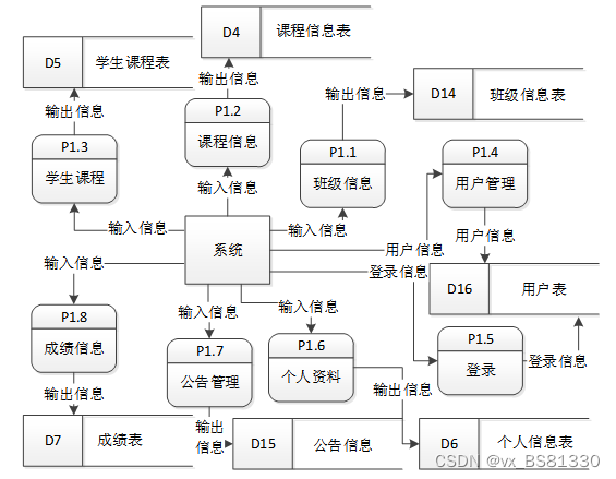 二层数据流程是对一层数据流层图中填写登录信息、用户功能的细化。即:填写登录信息细化为填制信息、后台审核,用户功能细化为用户管理,班级信息,课程信息,学生课程,成绩信息等操作。