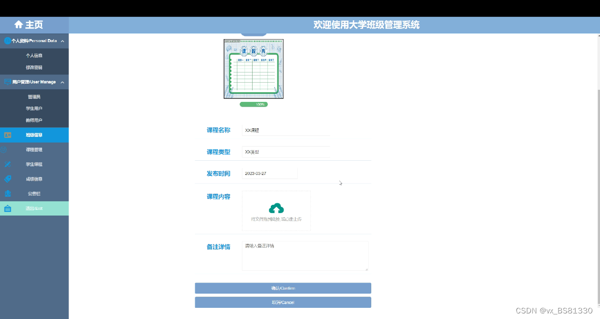 学生课程,在此管理页面可查询教师发布的课程,并进行确认操作,如下图所示。